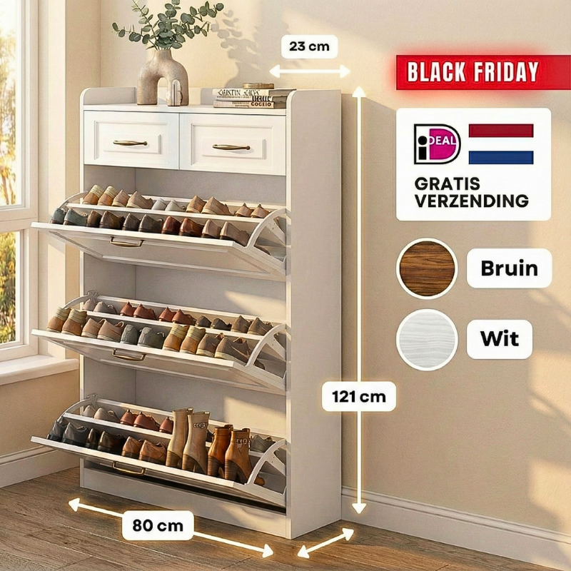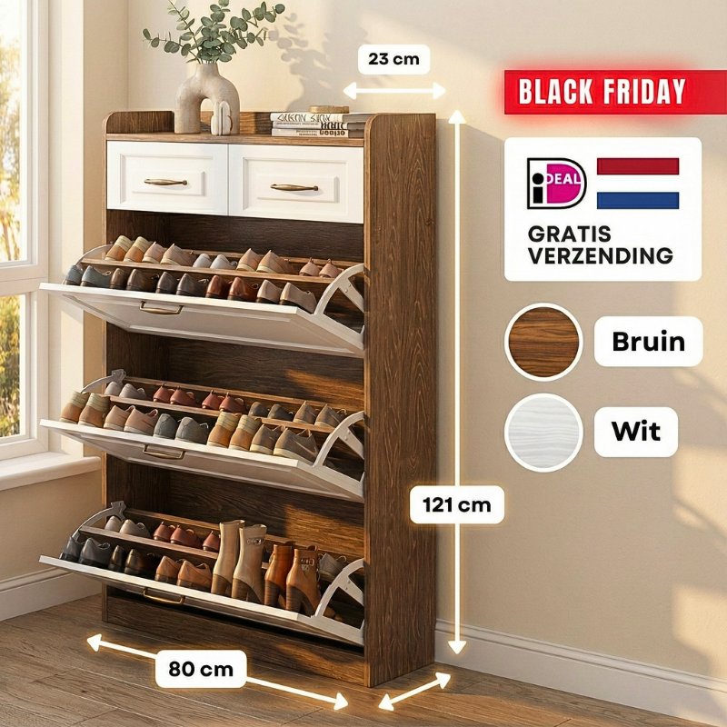 Met meerdere vakken biedt deze kast ruimte voor verschillende soorten schoenen. De vouwdeuren zorgen voor gemakkelijke toegang en houden uw schoenen stofvrij en netjes.